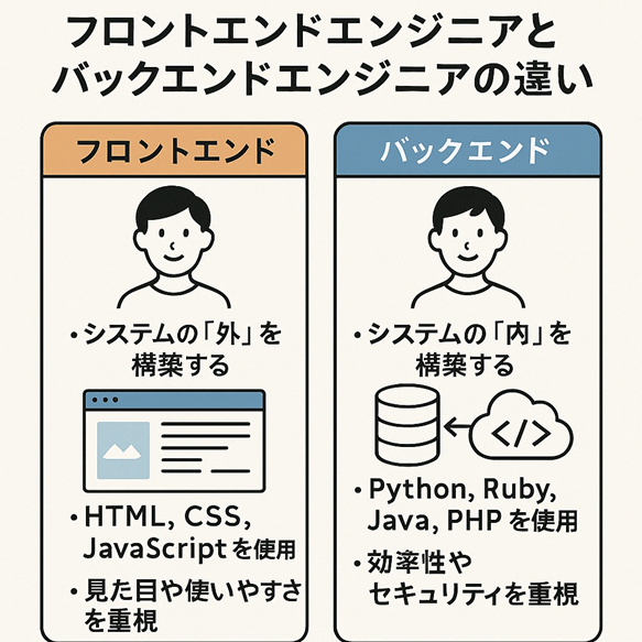 つまりフロントエンジニアは『外』を作る人で、バンクエンドエンジニアは『内』を作る人です。
