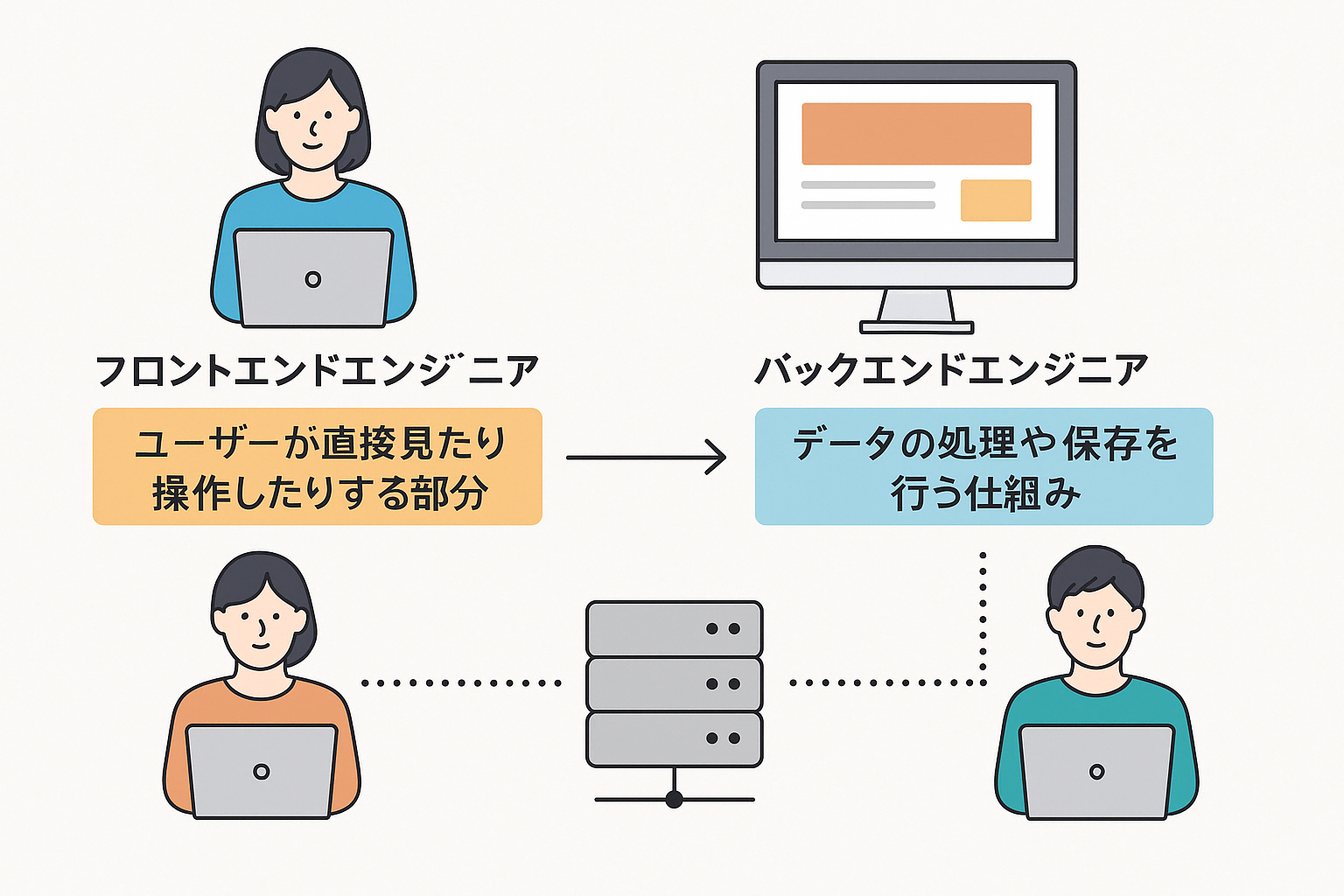 - 『バックエンド』・・・ユーザーがWebサイトやアプリで見たり使ったりする画面の裏側で、必要なデータを処理したり、保存したりする仕組み全般の領域。